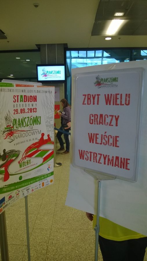 Wróciłem właśnie z “niewielkiego” konwentu “Planszówki na Narodowym” – jak sama nazwa wskazuje odbywa się (jeszcze przez godzinę) na Stadionie Narodowym w Warszawie. Piszę niewielkiego dlatego, że jest krótki – tylko 8h, natomiast nie dlatego, że jest mały – co to to nie. Konwent odbywa się w przestrzeni biurowej na stadionie (płyta główna była zajęta przez maratończyków) i w kilku naprawdę dużych salach, gracze, rodziny i dzieci mogły pograć w przeróżne gry.