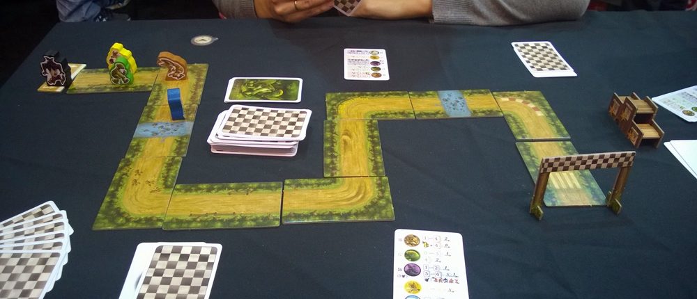 Po wypitej kawie, zawędrowaliśmy na stoisko iEllo, gdzie postanowiliśmy spróbować nowego King of New York. Oczywiście wszystkie stoliki zajęte więc usiedliśmy do gry z serii “bajkowych” – Tales and Games: The Hare & the Tortoise. Tytuł mówi sam za siebie – gracze niczym w Pędzących Żółwiach będą sterować leśnymi zwierzętami próbując aby ich faworyci (wybrani potajemnie na początku gry) dotarli na metę pierwsi. W zależności ile kart danego stworzenia będzie na stole, może ono poruszać się szybciej, wolniej a czasami wcale. Sporo decyzji, ale sporo też szczęścia. Na pewno przyjemniej grałoby się w więcej niż dwie osoby, ale chętnych nie było za wiele bo wszyscy czekali na Potwory w Nowym Yorku 😉