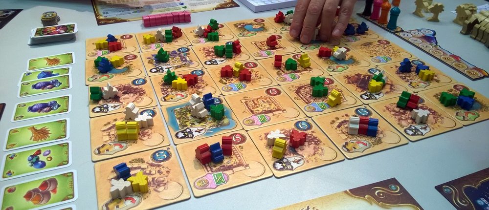 Ostatnim tytułem, którego spróbowaliśmy jest Five Tribes. Jeżeli miałbym krótko opisać tę grę powiedziałbym, że to przyjemne, lekko-mózgożerne, suche euro. Wszystko w tej grze działa bardzo sprawnie. Głównym pomysłem tej gry jest przemieszczanie drewnianych meepli a’la Mancala. Podnosimy np. trzy kolorowe meeple i poruszamy się po planszy, zostawiając po jednym na kolejnych polach. Na trzecim, czyli ostatnim polu, w zależności od tego jakiego koloru ludzika tam położymy, użyjemy innej akcji: