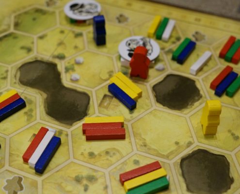 Pewnie warto powiedzieć parę słów o tym jak dokładniej zdobywamy kości. Na planszy złożonej z heksów, będziemy poruszać naszym ludzikiem, który trzy razy w czasie fazy wykopalisk będzie mógł podnieść kości na polu na którym się znajduje, a następnie przesunąć się dowolnie daleko, ale tylko w linii prostej, na inne pole wykopaliska. Czasami na drodze staną nam pola ze smołą albo inni gracze. Jeżeli będą nam się za bardzo plątać pod nogami, możemy spróbować im poprzeszkadzać w bardziej bezpośredni sposób. Bowiem po wykonaniu ruchu możemy wykonać jedną akcję. Może to być np ufundowanie kości dla muzeum (za co dostaniemy punkty albo poprawimy swoją reputację), wpłynięcie na punkty przyznawane w poszczególnych kategoriach muzealnych (publikacja), ale możemy też uciec się do fortelu i np ukraść kość z pola obok, albo użyć dynamitu aby wysadzić to co akurat jest na polu na którym stoimy i pociągnąć inne kości z woreczka. Sami przyznacie, że nie są to najbardziej honorowe uczynki, dlatego po wykorzystaniu takich forteli (pełną listę akcji możecie przeczytać we wpisie wydawnictwa o grze) musimy pociągnąć żeton niesławy. Na jego odwrocie widnieją punkty od 1 do 3. Możemy się tych żetonów pozbyć (właśnie poprzez podarowanie znalezionych kości muzeom), bo jeżeli tego nie zrobimy na koniec możemy dostać dość duży zastrzyk punktów ujemnych. Bowiem po trzeciej wystawie, podliczamy punkty niesławy (które do tej pory powinny być ukryte przed wzrokiem innych graczy), a ten gracz który będzie ich miał najwięcej musi odjąć je od swojego wyniku. Pozostali gracze natomiast te punkty dodadzą do swojego wyniku! W ten sposób jesteśmy trochę zachęcani do tego żeby nie zachowywać się cały grzecznie, a autor jednocześnie trzyma nas trochę na wodzy żebyśmy za bardzo nie rozszaleli się z dynamitem czy podkładaniem świń innym graczom.