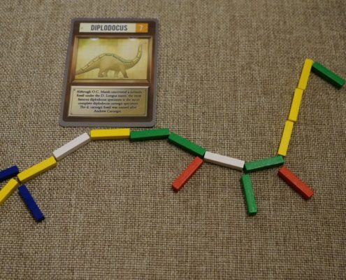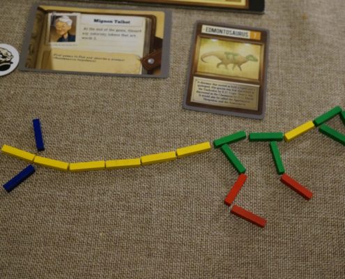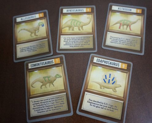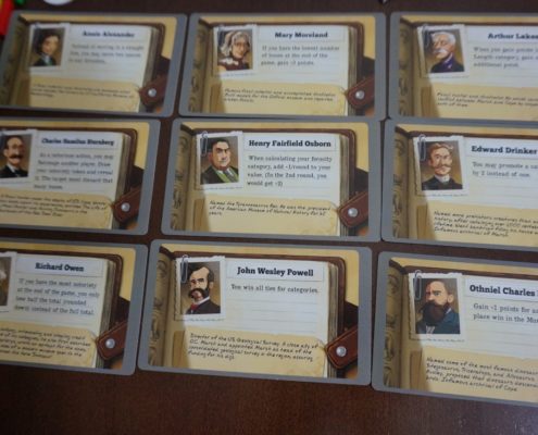 Zanim podzielę się z Wami moim wrażeniami, warto wspomnieć o walorze edukacyjnym tej gry. Po pierwsze każdy z graczy na początku gry dostaje do ręki postać paleontologa wzorowanego na historycznej postaci, z jakąś charakterystyczną dla niego zdolnością specjalną. Autorowi udało się odwzorować faktyczne wydarzenia i osiągnięcia paleontologów, opisanych dodatkowo na kartach w postaci tych specjalnych zdolności. Przed pierwszą rozgrywką dobre 10 minut siedzieliśmy i czytaliśmy opisy osób, w które przyjdzie nam się wcielać. Nie zapomnijmy jednak o dinozaurach bo to one grają tu pierwsze skrzypce. W czasie rekonstrukcji możemy oczywiście budować nasz szkielet w zasadzie w dowolny sposób. Jednak w czasie rozgrywki będziemy zdobywać karty dinozaurów, na których możemy oprzeć przynajmniej w pewnej częście nasze szkielety. Wystarczy, że żebra będą w odpowiedniej liczbie i ułożone w konkretny sposób podyktowany przez kartę i nasz dinozaur może uchodzić za Apatozaura. Co z tego że nie jest zupełnie podobny – liczba żeber się zgadza i nikt mi nie wmówi że tak Apatozaur nie wyglądał. Trzymanie się tych wskazówek da nam dodatkowe punkty, a jednocześnie możemy oczywiście poczytać o tych prehistorycznych gadach.