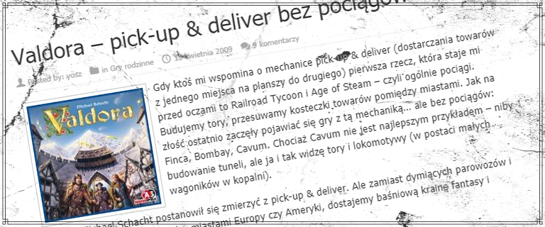 Dzisiaj mija 10 lat odkąd ukazała się moja pierwsza recenzja gry planszowej. Była to Valdora Michaela Schachta i jak na tego autora to była całkiem tematyczna. Miała też ciekawy gadżet w postaci książki zamówień, a tak najprościej mówiąc była grą typu Pick-Up-And-Deliver, czyli podnieś i dostarcz. Recenzja oryginalnie ukazała się na łamach portalu Games Fanatic, do którego po jakimś czasie dołączyłem na stałe. Były to jeszcze czasy kiedy w GF pisali Pancho, ja_n, Don Simon i Bazik. Ksywki, które być może niektórym z Was już nic nie mówią, ale to te osoby (i oczywiście wiele innych) rozkręcały scenę planszówkową te 10 lat temu (i wcześniej). Może o mnie również kiedyś zapomnicie i jak przez mgłę będziecie pamiętać yosza / Marcina, który kiedyś pisał i nagrywał recenzje gier planszowych